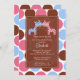 Convite de Chá de fraldas para gêmeos adoráveis, com uma girafa rosa e azul definida com um fundo de bolinhas castanho, azul e rosa. Itens correspondentes disponíveis em nosso compro. Perfeito para um chá de fraldas de menina. ©Stockberry Studio