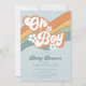 Oh Baby Retro Chá de fraldas Invitation com fundo azul-boho, flores margaridas dispersas, arco-íris, e as palavras "oh Boy" na fonte do rancho 70. Sacudir nosso doce convite para ver um azul de volta.