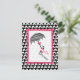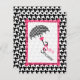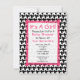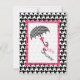 Um convite para chás de fraldas com um fundo sonoro preto-e-branco e uma seção de centro de brilho esboçada em rosa-quente na frente e atrás. A ilustração da frente de um guarda-chuva impressão de som com arco rosa na alça. O texto "Chá de fraldas" trava da alça. Personalize o lado oposto com detalhes da sua ocasião.