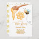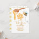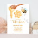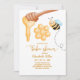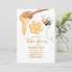 Um pouco de mel está a caminho. Junte-se a nós para um Chá Babee! Ilustração de um pente de mel e uma abelha em estilo de pintura digital.