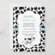 Convite para Chá de fraldas Impressão de Vaca Negra Azul. Design apresenta um gráfico fofo de uma vaca, arco azul, fundo impressão de vaca e fita de coração azul. Adorável design para rapazes.