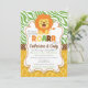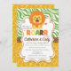 Todos vão se divertir com este adorável convite para chás de fraldas da selva. Possui um lindo leão bebê com fundo de impressão animal.