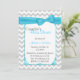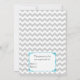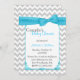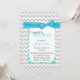 Convite para chá de fraldas de Na moda casal feito em uma cinza clara e um padrão ziguezague branco chevron. Gráficos de uma área de texto branco de borda decorativa turquesa, no meio, têm uma fita e um arco bonito turquesa, no topo. A parte de trás é feita no mesmo padrão de chevron, com outra área de texto branca, na parte inferior. Personalize todo o texto, de frente e de volta para atender às suas necessidades de evento.