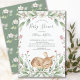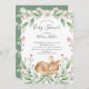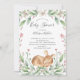 Veado adormecido bonito enquadrado com verde foliar e flores cor-de-rosa. Sacudir a nossa floresta convida para ver uma floral coordenada de volta para um toque especial extra.