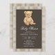 Celebre o seu pequeno com charme de eterno através do nosso convite de chá de fraldas inspirado no esporte equestre do polo e do estilo clássico do clube country. No topo, um ursinho de peluche em tons neutros leves dá um tom refinado, vestido com sutil elegância. O texto apresenta uma mistura graciosa de caracteres clássicos de caligrafia e serif, enquanto uma borda de tartan escocesa de xadrez suave adiciona um toque de sofisticação subestimada. Perfeito para uma celebração polida e sincera enraizada na tradição.
