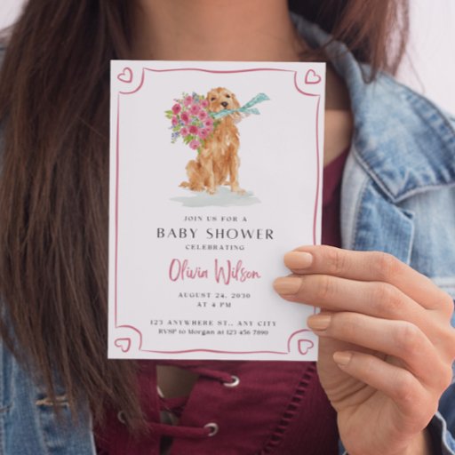 Estes convites apresentam um retrato de aquarela adorável de um Retriever Ouro segurando um buquê de flores cor-de-rosa.