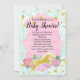 Crie um chá de fraldas mágico de conto de fadas unicórnio para a menina recém-nascida com este belo convite de unicórnio. Personalizável com um unicórnio branco, flores bonito, púrpuras e cor-de-água cor rosa, rosas claro e turquesas azuis e douradas e estrelas brilhantes impressas.