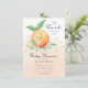 Um doce pouco de pêssego está no caminho do convite do chá de fraldas com um adorável pequeno pêssego e folhas verdes colocadas sobre um fundo de pêssego com aquarela com um confete de ouro espalhado. Visite nosso compro para ver nossa doce coleção de design de pêssego.