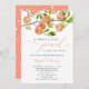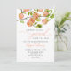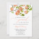 Cartão de convite à chá de fraldas com ponto de pêssego russo neutro do ponto de vista do gênero, com ilustração da fruta de jardim em um galho de árvore. Perfeito para o chá de uma garota no verão.