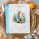 Uma ilustração encantadora de aquarela de Peter Rabbit, retratada como adorável e clássica. O conto clássico de Peter Rabbit é o tema perfeito para o seu chá de fraldas. O convite apresenta um belo desenho aquoso do personagem, Peter Rabbit, acentuado com um arranjo de verde escovado. Os detalhes do seu chá são exibidos em uma variedade de fontes complementares.