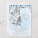 Um chá de fraldas de elefante com elefante bebê giro com coroa príncipe e tronco num fundo azul de aquarela. Este belo convite para o chá de fraldas de elefantes é facilmente personalizado com os detalhes do seu evento no estilo de fonte que você prefere.