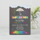 Este encantador Chá de fraldas Rainbow Rainbow O Convite apresenta um guarda-chuva branco de bolinhas arco-íris debaixo de nuvens macios em meio a quedas de gotas de arco-íris caindo que piscina numa poça colorida de arco-íris. Isto é tudo sobre um fundo preto, de quadro negro. A parte de trás do convite é um fundo preto no estilo do giz é uma chá de queda de arco-íris.
