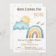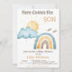 Celebre o seu bebê ensolarado com este retrato Aqui Vem o convite digital editável para o Filho! Perfeito para um chá de fraldas de verão, este convite para chás de fraldas de menino trará calor e alegria ao seu evento. Personalize facilmente e espalhe as vibrações ensolaradas para todos os seus convidados!