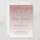 Este convite de chá de fraldas de tendência apresenta uma borda de brilho brilhante de cintilação falsa de rosa de ouro em um fundo de rosa de ouro ombre. As palavras "Chá de fraldas" e o nome da futura mãe aparecem no roteiro de escrita à mão do rosa escuro, com o texto restante na letra do serif do rosa escuro.