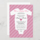 Estamos empolgados por oferecer este doce e simples design chá de fraldas. Um gráfico branco de maiô de bebê é mostrado no topo de listras diagonais cor-de-rosa de dois tons. Um simples símbolo cardíaco é colocado no meio. Personalize o texto desse produto para ocasiões pequenas como anúncios, revelações de gênero etc.