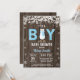 Convite Rustic Penguin Winter Boy Chá de fraldas. Floco de neve branco. O bebê está frio fora do Chá de fraldas convite.Convite para Chás de fraldas. Chá de fraldas De Feriado De Inverno Convide. Fundo Da Madeira Rústica. Campo de Vintage Retro Barn.