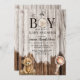Um convite para chá de fraldas de garoto rústico giro com duas tonalidades de madeira branca e castanha de celeiro com ursos peludos e chatos. Para uma vibração moderna rústica, com a frase "oh boy"!