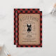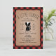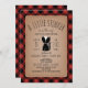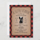 Um convite de chá de fraldas com ilustração de um gambá bebê. Personalize o texto. O fundo é vermelho e a xadrez preta de lenhador inspira o padrão de xadrez de búfalo.