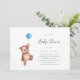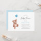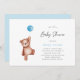Um convite chá de fraldas com um ursinho de pelúcia e um balão azul para um bebê. Itens correspondentes disponíveis na coleção Teddy Bear Theme.