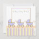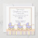 Três vezes mais divertido! Este é o anúncio deste convite para chás de fraldas que apresenta três adoráveis carruagems de bebês azuis com listras azuis, amarelas e marrons.
