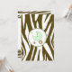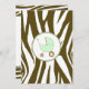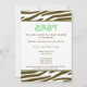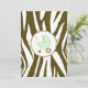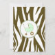 Um convite com uma borda de impressão em zebra castanha, por cima e por baixo, com um formato verde claro. Personalize o texto das fontes do tango e verde marrom e da letra preta com detalhes do seu evento. O lado oposto é uma impressão zebra sólida com uma dentro de bebê verde, com uma estrutura em forma de círculo correspondente.