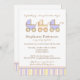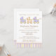 Triplo a alegria! Este é o anúncio deste convite para chás de fraldas que apresenta carruagems adoráveis para bebês, rosa e azuis, com listras cor-de-rosa, azuis, amarelas e bronzeadas sobre um fundo branco.