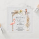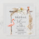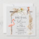 Chá de panela maravilhoso apresenta arco de casamento boho com flamingo cor-de-rosa e pássaro exótico em observação e adornada com flores tropicais, protea e pampas.