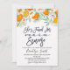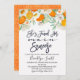O chá de panela de espreme principal de laranja floral convida as laranjas brancas e as laranjas ou o chá de panela de mandarina apresentando uma caligrafia de pincel em preto. A parte de trás do convite é uma imagem de lavagem de cor d'água laranja com um pequeno padrão de ponto branco. Este chá de panela temático dos citros é um design doce e uma maneira adorável de convidar convidados para um chá de panela que vem pela frente.