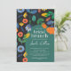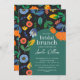 Design moderno de brunch bridal com flores grandes e coloridas em amarelo alaranjado e azul com um arco moderno mostrando suas informações sobre o partido.