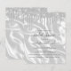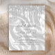 Um design moderno, chic, com uma seda branca ou fundo de satélite com uma borda superior de gotas de luz prateada. As palavras "chá de panela" e o nome da noiva a ser aparecem em um roteiro de caligrafia em minúsculas com traços decorativos no início e no fim, com o texto restante em fonte sans serif. O fundo branco da bacia e a borda da gota de luz prateada são repetidos no sentido inverso. (Para guardar as hastes, substitua apenas as letras do nome da noiva, deixando os símbolos no lugar.)