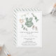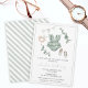 Cartão postal de chá de bebê boêmia elegante, com cor aquosa, eucalipto verde e roupas bonitas de bebê, brinquedos.