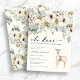 Convite para Chá do Deer Baby Boy. Este elegante convite para chá de fraldas 'oh veado' de inverno apresenta lindas folhas e bagas azuis poeirentas pintadas à mão, flores de anêmona creme, verde-salva e pinecones organizados como um quadro de na moda num marfim | fundo creme e veado aquoso adorável. Encontre itens correspondentes na Coleção de Casamentos Florais Blue Dusty de inverno.