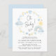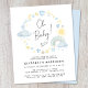 Convite para chá de um bebê bonitinho e amigável, com orçamento, apresentando cores azul pastel e amarelas, inspiradas em boho, de um arco-íris, sol, corações, estrelas, luas e nuvens e "Oh Baby!" em um roteiro de caligrafia na moda.