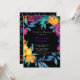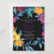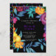 Design apresenta um elemento floral colorido impresso em tons de cor laranja, cor-de-rosa, verde e púrpura, em fundo preto com faixa de papel picado. Caligrafia ou escrevendo de tipo. Misturar e combinar peça de coleção. Excelente para as comemorações do casamento!