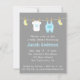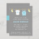 Há algo tão fofo sobre roupas mini e acessórios para bebês! E isso faz dele um design maravilhoso e atraente para um adorável convite para chás de fraldas. Esta design moderna inclui lindos artigos para bebês, como meias amarelas para bebês, um macacão branco para bebês com uma coroa azul de príncipe e um macacão azul pastel com bolso pendurado num lençol de roupas com pinos de madeira. A página inversa inclui uma faixa azul que diz "É um garoto!". As cores de Pastel destacam-se no fundo da cinza e dão uma elegância a ele. Personalize facilmente com os detalhes do seu partido.