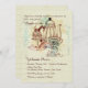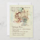 Um convite para o chá e sobremesas com o charme "Velho Mundo". O fundo de cor creme tem marcas d'água azuis e bolinhas sutis e apresenta um bule de chá, uma xícara elegante e uma sobremesa deliciosa.
