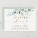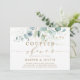 Este convite para chás apresenta cores aquáticas pintadas de eucalipto, folhas botânicas verdes e douradas com guião dourado.