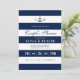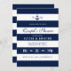 Um convite ousado, mas moderno, para chás de temas náuticos, que inclui um ponto para a noiva e os monogramas de noiva e de noivos e informações relevantes sobre o seu evento dentro de faixas horizontais.