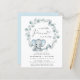 Um convite de chá para bebês bonitinho e econômico com "Um Doce Pequeno Amendoim Está a Caminho" escrito numa mistura de tipografia moderna e um roteiro de na moda, e uma aquarela de um elefante para bebês azul pastel numa coroa de verde eucalipto. Adicione os nomes da mãe e do pai em tipografia simples.