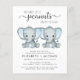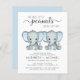 Um convite para casal de gêmeos bonitinho e econômico com "Dois Pequenos Amendoins Doce Estão A Caminho" escrito em tipografia moderna de cinza mole e um roteiro de na moda, e duas aquarelas azuis pastéis de elefantes bebês. Personalize os nomes dos futuros pais e os detalhes do chá em simples tipografia de cinzas.