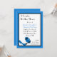 Casais divertidos convite para chás de casamento feito em um tom azul bonito, preto, prateado e branco. Gráficos de uma moldura azul, preta, branca e prata, em torno de uma área de texto branca, com um na moda azul e um calcanhar preto para chutar um futebol azul e preto. O texto azul e preto é totalmente personalizável para personalizar para o seu chá de casamento. Excelente para o casal do fã de futebol.