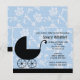 Este belo convite para Chás de fraldas está apenas esperando para ser personalizado com seus detalhes. Este design azul e preto moderno apresenta um carrinho e um motivo floral.
