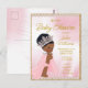 Chá de fraldas da princesa negra com adorável princesa bebê com cabelo afro e bonito com bonito coroa de diamante e capa em bonito rosa e fundo dourado. Este cartão postal de convite para chá de fraldas princesa é facilmente personalizado com os detalhes do evento.