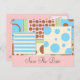 Bolinhas e listras em padrões de blocos - castanho, rosa, azul, verde e amarelo macio. Estes criam um fundo perfeito para chás de fraldas para rapazes, raparigas, gêmeos e festas uníssonas. Altere o plano de fundo para remover a borda inferior rosa. Adicione azul, amarelo ou marrom para um convite mais neutro ou masculino.