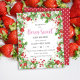 Trata-se de um convite à apresentação de chás de fraldas à base de morango e acessível, com um quadro de morangos, flores brancas e verde. É complementada com uma tipografia divertida no estilo da caligrafia e um reverso das sementes de morango doce. Perfeito para uma menina e primavera para comemorações de verão.