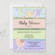 Um convite para chás de fraldas bonito e neutro, com designs listrados e pastel, com figuras de desenho animado de roupas de bebê e ursinho de pelúcia em uma ameixa.