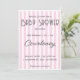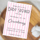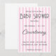 Este elegante convite para o chá de fraldas apresenta um charmoso fundo rosa e listrado branco, perfeito para celebrar as mamães a serem. O design inclui detalhes personalizáveis, como nome, data, hora, local e informações de registro. Ideal para criar um evento memorável para qualquer mãe esperada.