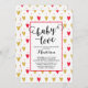 Convite para chá de fraldas divertido com ouro e corações vermelhos adornados com uma letra de script com letra na moda. Sacudir nosso chá de panela colorido convidar para ver um coração correspondente de volta.