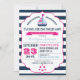 Fundo impressão de marinho de faixa branca e com cartão de convite para chá de fraldas de raparigas náuticas gêmeas náuticas flutuantes e salva-vidas.