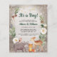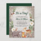 Casais de inverno rústicos e caros para fins de orçamento, convite para chás de fraldas com aquarelas bonitinhas de madeira, flores, verde e uma camada de estrelas de ouro e flocos de neve. "É um Rapaz!" ou "É uma Rapariga!" e os nomes da mãe e do pai estão escritos num guião verde florestal.